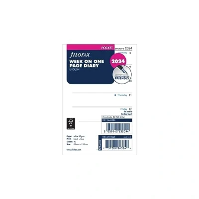 AmazonFilofaxPocket 2024 diary Week on one page format English language White paper Paper size 81 x 120 mm Organise two weeks at a glance with our pocket week on one page diary refill 80 gsm fountain pen friendly paper Compatible with Filofax Pocket size Organisers