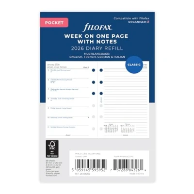 Filofax Pocket week per page with notes 4 language 2026 diary 26 68209