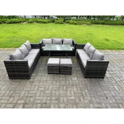 Fimous 11 Seater Rattan Outdoor Furniture Sofa Garden Dining Set with Patio Table 2 Small Footstools Dark Grey Mixed