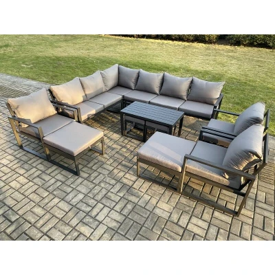 Fimous 13 Seater Aluminium Outdoor Garden Furniture Set Patio Lounge Sofa with Oblong Coffee Table Chair 2 Small Footstools Big Dark Grey