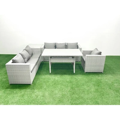 General description This deluxe rattan sofa set is a great addition to your patio or garden, made of high-quality PE rattan and durable galvanized steel construction for sturdiness and long-lasting use. It is designed for outdoor use all year round. Technical specifications Set Dimensions: 2 x Sofa with double armrest: 177W x 65D x 66H cm 1 x Armchair: 74L x 65W x 66H cm 1 x Side coffee table: 65L x 65W x 66H cm 1 x Rectangular Dining Table: 140L x 80W x 69H cm Material: Light grey mixed rattan with dark grey fabric Seat Cushion Thickness: 8 cm Glass Tabletop: 5 mm thickness transparent tempered glass Installation Items come flat packed and are easy to assemble. Sturdy galvanized steel tube metal frames with powder coating to prevent rust. Usage Low maintenance with removable cushion covers. Easy to move to different locations. Keep cushions indoors or use a rain cover when not in use. Use a rain cover if the furniture is not used for a long time. Other information For any issues with