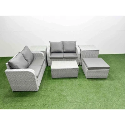 Fimous 5 Seater Outdoor Love Sofa Set Rattan Garden Furniture with Rectangular Coffee Table Big Footstool 2 Side Tables Light Grey