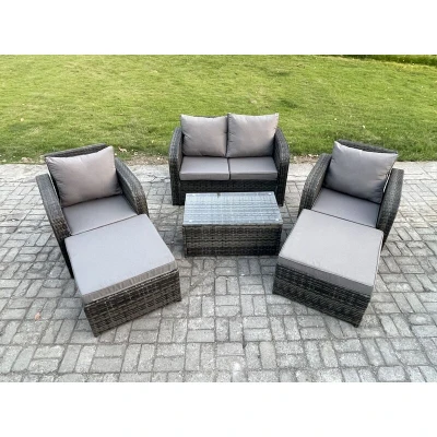 General description This 6-seater modern deluxe garden furniture set is perfect for various occasions. The rattan set boasts strong durability, ensuring it lasts for a long time, and features a sturdy tempered glass tabletop. Cushions are included, designed to fit the shape of the sofa and chairs for enhanced comfort. This stylish furniture set will elevate the look of any garden, patio, or conservatory. Technical specifications Set Dimensions: 2 x Big footstool: 65L x 65W x 34H cm 2 x Reclining Chairs: 74L x 67W x 79H cm 1 x Love Sofa: 124W x 67D x 79H cm 1 x Oblong Coffee Table: 85L x 50W x 37H cm Material: Dark grey mixed rattan with dark grey fabric Seat Cushion Thickness: 8 cm Glass Thickness: 5 mm tempered glass Installation Items come flat packed and are easy to assemble. Sturdy galvanized steel tube metal frames with powder coating to prevent rust. Usage The armchairs are adjustable, allowing you to change the backrest inclination from 90° to 130°. For maintenance, keep the