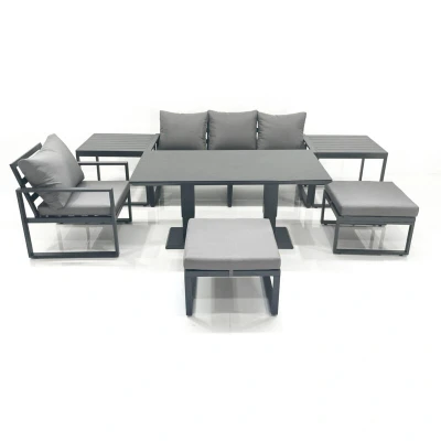 Fimous 6 Seater Garden Sofa Set Aluminium Furniture Rising Dining Tabe with Chair 2 Big Footstool Side Tables Dark Grey