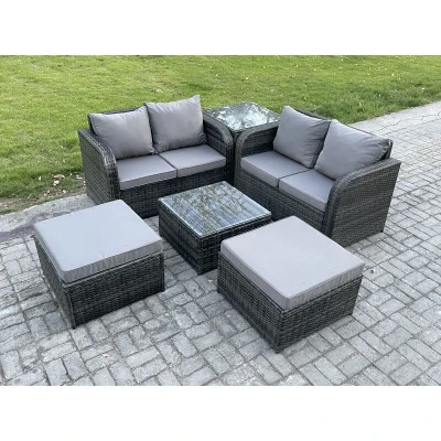 General description This 6-seater deluxe garden furniture set enhances your courtyard, deck, backyard, porch, or swimming pool area. Constructed from high-quality PE rattan and durable galvanized steel, it is designed to withstand adverse weather conditions in the UK. The set can be easily reconfigured to suit your needs. Technical specifications Set Dimensions: 1 x Side Coffee Table: 65L x 65W x 66H cm 2 x Big Footstools: 65L x 65W x 34H cm 2 x Love Sofas: 124W x 67D x 79H cm 1 x Square Coffee Table: 65L x 65W x 34H cm Material: Dark grey mixed rattan with dark grey fabric Seat Cushion Thickness: 8 cm Installation Items come flat packed and are easy to assemble. Includes sturdy galvanized steel tube metal frames with powder coating to prevent rust. Usage Low maintenance required. Removable cushion covers for easy cleaning. Keep cushions indoors or use a rain cover when not in use. Use a rain cover if the furniture is not in use for an extended period. Other information 5mm thick