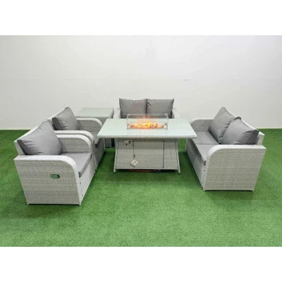 Fimous 6 Seater Outdoor Reclining Chair Love Sofa Set Rattan Garden Furniture with Firepit Dining Table Side Light Grey