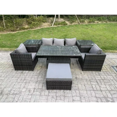 General description This deluxe rattan rising sofa dining set is an excellent addition to your patio or garden. It is made of high-quality PE rattan and features a durable galvanized steel construction, ensuring sturdiness and longevity. This furniture set is designed for outdoor use all year round. Technical specifications 1 x Sofa with double armrest: 177W x 65D x 66H cm 2 x Armchairs: 74L x 65W x 66H cm 1 x PC Rising dining table: 140L x 80W x 68/48H cm (height adjustable from 68 cm to 48 cm) 2 x Side coffee tables: 65L x 65W x 66H cm 1 x Big footstool: 65L x 65W x 34H cm Color: Dark grey mixed rattan with dark grey fabric Installation Items come flat packed and are easy to assemble. Usage The table can be used as both a coffee table and a dining table. It features a 5mm thick clear tempered glass top with suckers to prevent sliding. The set includes 8 cm thick seat cushions and soft pillow back cushions for added comfort. It is recommended to keep the cushions indoors or use a