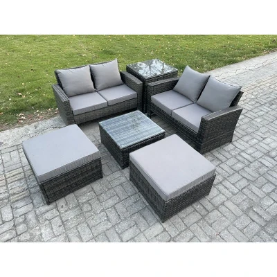 Fimous 6 Seater Rattan Outdoor Garden Furniture Sofa Set with 2 Big Footstool Side Table Dark Grey Mixed