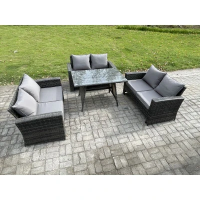 Fimous 6 Seater Rattan Wicker Garden Furniture Patio Conservatory Sofa Set with Rectangular Dining Table Love Seat