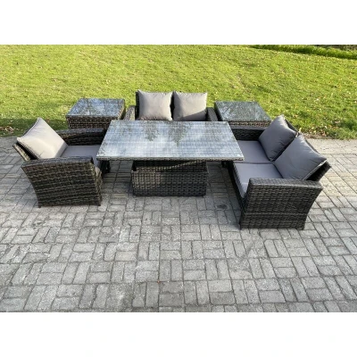 Fimous 6pcs Rattan Outdoor Garden Furniture Set Height Adjustable Rising Lifting Table Sofa Dining with 2 Side Tables Dark Grey Mixed