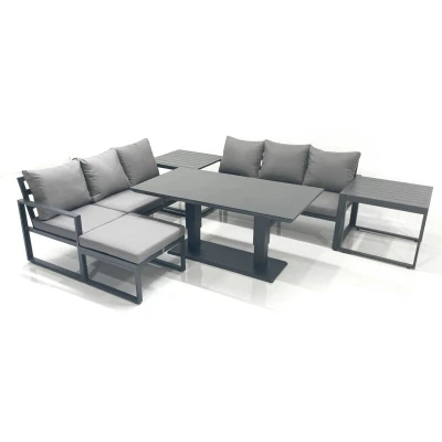 Fimous 7 Seater Aluminium Outdoor Garden Furniture Set with Adjustable Rising Lifting Dining Table 3 Sofa Big Footstool 2 Side Tables Dark Grey