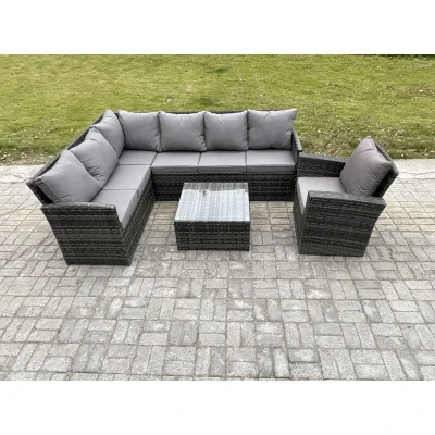 Fimous 7 Seater Outdoor Garden Furniture Set Wicker PE Rattan Corner Sofa with Square Coffee Table Armchairs Dark Grey Mixed