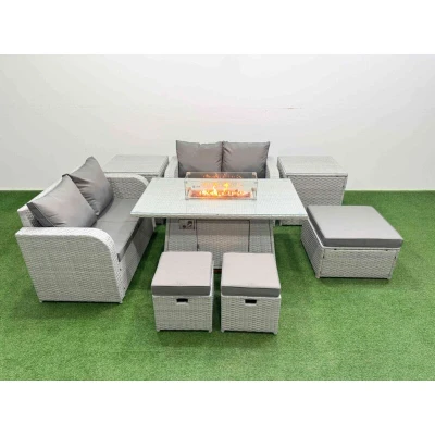 General description This Fimous 7 Seater Outdoor Love Sofa Set is a stylish and comfortable addition to your garden or patio. Made from light grey PE rattan with dark grey fabric, this set includes two love sofas, two side tables, a firepit dining table, and three footstools. The design is not only aesthetically pleasing but also practical, featuring removable cushion covers for easy maintenance. Technical specifications Set Dimensions: 2 x Love Sofa: 124W x 67D x 79H cm 2 x Side Table: 65L x 65W x 66H cm 1 x Big Footstool: 65L x 65W x 34H cm 2 x Fully Assembled Stools: 40W x 40D x 34H cm 1 x Firepit Dining Table: 140L x 80W x 69H cm Material: Light grey PE rattan with dark grey fabric Thickness of Glass: 5mm transparent tempered glass Seat Cushion Thickness: 8 cm Installation Items come flat packed and are easy to assemble. Sturdy galvanized steel tube metal frames with powder coating to prevent rust. Usage For optimal safety, place the gas fire pit on the glass top, not underneath