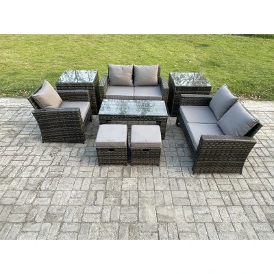 Fimous 7 Seater Outdoor Rattan Patio Furniture Set Garden Lounge Sofa with 2 Side Tables Small Footstools Coffee Table Dark Grey Mixed