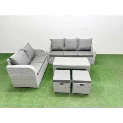 General description This deluxe Garden furniture set enhances the decor of your courtyard, deck, backyard, porch, and swimming pool. It is constructed from high-quality PE rattan and durable galvanized steel, designed to withstand adverse weather conditions in the UK. The set can be easily configured into different arrangements to suit your needs. Technical specifications 1 x Love Sofa Size: 124W x 67D x 79H cm 1 x 3 Seater Sofa Size: 177W x 67D x 79H cm 2 x Fully Assembled Stools: 40W x 40D x 34H cm 1 x Rectangular Coffee Table: 105L x 50W x 48H cm Seat Cushion Thickness: 8 cm Material: Light grey PE rattan with dark grey fabric Glass Tabletop: 5mm thickness transparent tempered glass Installation Items come flat packed and are easy to assemble. Sturdy galvanized steel tube metal frames with powder coating to prevent rust. Usage Keep the cushions indoors or use a rain cover when not in use. For long-term storage, cover the furniture with a rain cover. Other information Removable