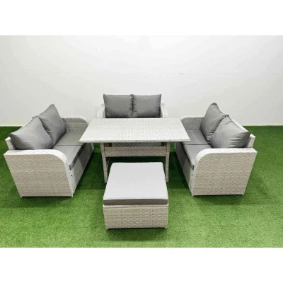 General description This deluxe garden furniture set enhances your courtyard, deck, backyard, porch, or swimming pool area. Made from high-quality PE rattan and durable galvanized steel, it is designed to withstand adverse weather conditions in the UK. The set can be easily configured into different arrangements to suit your needs. Technical specifications 3 x Love Sofa Size: 124W x 67D x 79H cm 1 x Big Footstool Size: 65L x 65W x 34H cm 1 x Dining Table Size: 140L x 80W x 68H cm Material: Light grey PE rattan with dark grey fabric Seat Cushion Thickness: 8 cm Glass Thickness: 5 mm tempered glass Installation Items come flat packed and are easy to assemble. Includes sturdy galvanized steel tube frames with powder coating to prevent rust. Usage Removable cushion covers for easy maintenance. Keep cushions indoors or use a rain cover when not in use. Use a rain cover if the furniture is not in use for an extended period. Other information Factory direct sale guarantees quality and