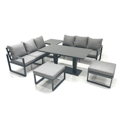 Fimous 8 Seater Aluminium Outdoor Garden Furniture Set with Adjustable Rising Lifting Dining Table 3 Sofa 2 Big Footstool Side Dark Grey