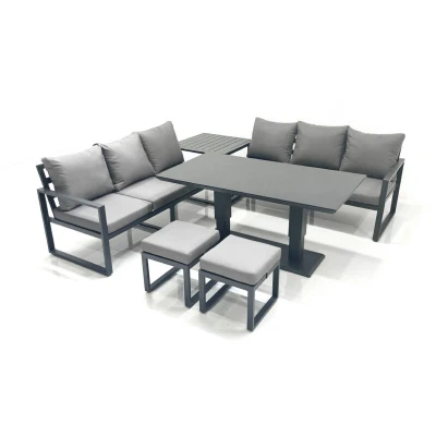 Fimous 8 Seater Aluminium Outdoor Garden Furniture Set with Adjustable Rising Lifting Dining Table 3 Sofa 2 Small Footstool Side Dark Gre
