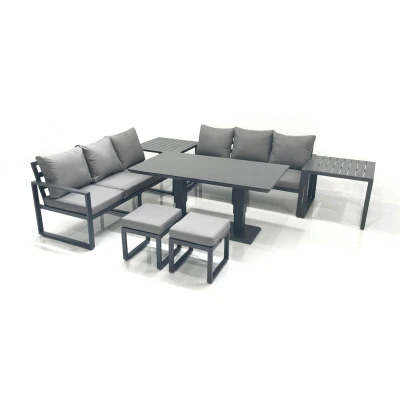 General description This deluxe aluminium outdoor sofa set is a great addition to your patio or garden, made of high-quality alloy aluminium and powder coating for sturdiness and structural durability. The set includes two 3-seater sofas, two side tables, two footstools, and an adjustable dining table, providing ample seating and functionality for outdoor gatherings. Technical specifications Set Dimensions: 2 x 3 Seater Sofa: 166W x 73D x 78H cm 2 x Side Coffee Table: 68L x 68W x 59H cm 2 x Fully Assembled Stool: 40L x 40W x 36H cm 1 x Adjustable Dining Table: 140L x 80W x 48/70H cm (Low 48 cm, Height 70 cm) Material: Alloy aluminium with powder coating Cushion Thickness: 9 cm Usage The table can stop at any height between 48 cm and 70 cm, allowing for versatile dining options. The set features removable cushion covers for easy maintenance and should be kept indoors or covered when not in use to prolong its lifespan. Other information Color: Dark grey powder coated with dark grey