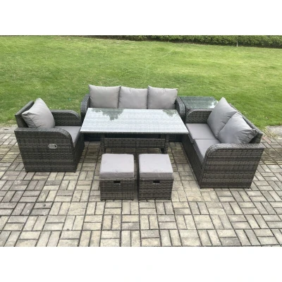 Fimous 8 Seater Garden Rattan Furniture Dining Table Sofa Set Indoor Outdoor with Reclining Chairs Side 2 Small Footstools Dark Grey Mixed