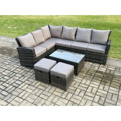 Fimous 8 Seater Outdoor Furniture Garden Dining Set Rattan Corner Sofa with Rectangular Coffee Table 2 Small Footstools Dark Grey Mixed