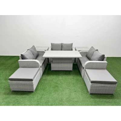 General description This deluxe Garden furniture set enhances the aesthetic of your courtyard, deck, backyard, porch, or swimming pool. It is constructed from high-quality PE rattan and durable galvanized steel, designed to withstand adverse weather conditions. The set can be easily configured into different arrangements to suit your needs. Technical specifications 3 x Love Sofa Size: 124W x 67D x 79H cm 2 x Side Table Size: 65L x 65W x 66H cm 2 x Big Footstool Size: 65L x 65W x 34H cm 1 x Lifting Table Size: 140L x 80W x 68/48H cm (height adjustable: up 68 cm, down 48 cm) Seat Cushion Thickness: 8 cm Installation Items come flat packed and are easy to assemble. Includes sturdy galvanized steel tube frames with powder coating to prevent rust. Usage Removable cushion covers for easy maintenance. Recommended to keep cushions indoors or use a rain cover when not in use. For long-term storage, cover the furniture with a rain cover. Other information Light grey PE rattan with dark grey