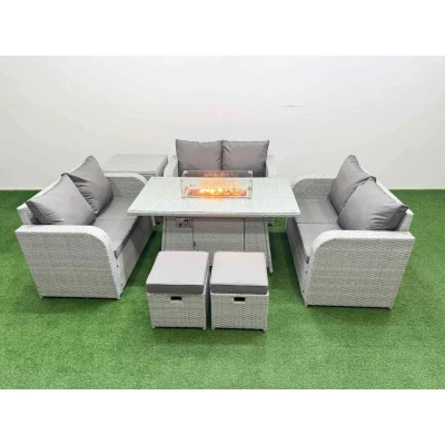 Fimous 8 Seater PE Wicker Rattan Furniture Sofa Sets with Firepit Dining Table 2 Love Stool Side Light Grey