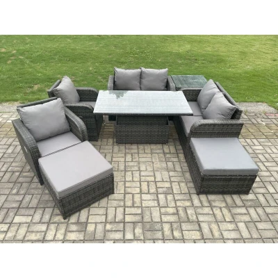 Fimous 8 Seater Rattan Furniture Garden Dining Set Outdoor Height Adjustable Rising lifting Table Love Sofa Chair With Side 2 Footstools