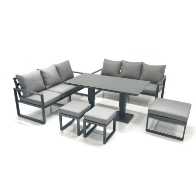 Fimous 9 Seater Aluminium Outdoor Garden Furniture Set with Adjustable Rising Lifting Dining Table 3 Sofa Footstools Dark Grey