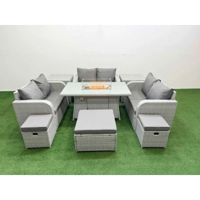 Fimous 9 Seater PE Wicker Rattan Furniture Sofa Sets with Firepit Dining Table 2 Love 3 Stool Side Light Grey