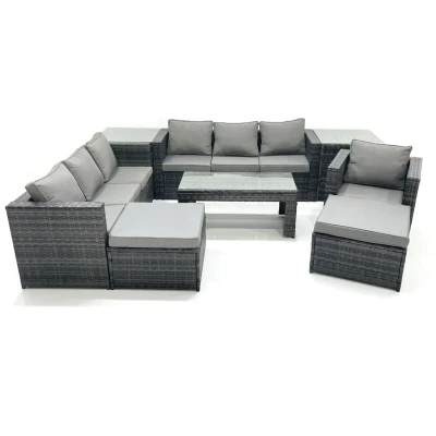 General description This Fimous 9 Seater Rattan Garden Outdoor Furniture Set is designed for both indoor and outdoor use. Crafted with high-quality PE rattan and a durable galvanized steel construction, this set ensures sturdiness and longevity. Its elegant design combines country chic with modern minimalism, making it a stylish addition to any patio, balcony, or garden. Technical specifications Set Dimensions: 2 x Double armrest Sofa: 176W x 65D x 66H cm 1 x Chair: 74W x 65D x 66H cm 2 x Side Table: 65W x 65D x 66H cm 2 x Big Footstool: 65W x 65D x 34H cm 1 x Oblong Coffee Table: 105L x 50W x 48H cm Sofa Weight Capacity: 250 kg Color: Dark grey mixed PE Rattan Installation Items come flat packed and are easy to assemble. Sturdy galvanized steel tube metal frames with powder coating to prevent rust. Usage Low maintenance with removable cushion covers. Keep cushions indoors or use a rain cover when not in use. Use a rain cover for the furniture if not in use for an extended period.