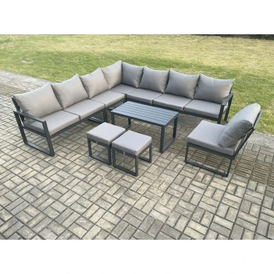 Fimous Aluminium 10 Seater Patio Outdoor Garden Furniture Lounge Corner Sofa Set with Oblong Coffee Table 2 Small Footstools Dark Grey