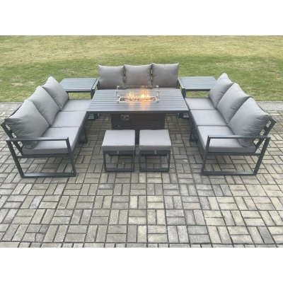 Fimous Aluminium 11 Seater Garden Furniture Outdoor Set Patio Lounge Sofa Gas Fire Pit Dining Table with 2 Small Footstools Side Tables Dark