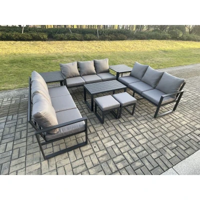 Fimous Aluminium 11 Seater Outdoor Garden Furniture Set Lounge Sofa Oblong Coffee Table 2 PC Small Footstools Side Sets with Cushions Dark