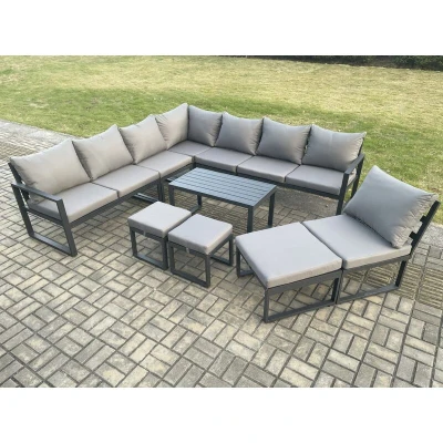 Fimous Aluminium 11 Seater Patio Outdoor Garden Furniture Lounge Corner Sofa Set with Oblong Coffee Table 3 Footstools Dark Grey