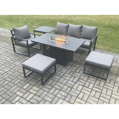 Fimous Aluminium 6 Pieces Garden Furniture Sofa Set with Cushions Gas Fire Pit Dining Table 2 Big Footstools Side Dark Grey