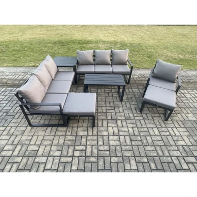 Fimous Aluminium 7 Pieces Garden Furniture Set with Cushions 9 Seater Outdoor Patio Lounge Sofa Armchair 2 Big Footstools Side Table Dark Gre
