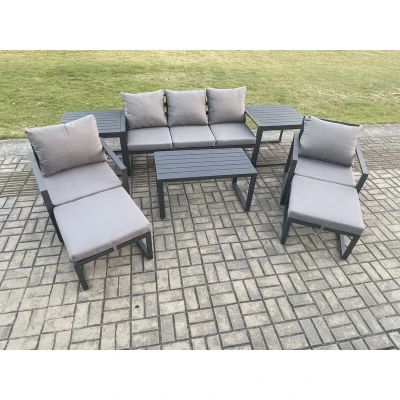 Fimous Aluminium 8 Pieces Garden Furniture Sofa Set with Cushions 7 Seater Outdoor Patio 2 Armchair Big Footstools Side Tables Dark Grey