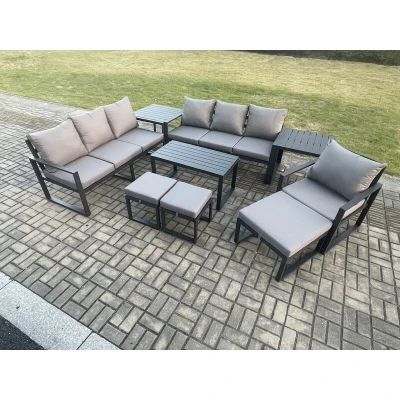 Fimous Aluminium 9 Pieces Garden Furniture Set with Cushions 10 Seater Outdoor Patio Lounge Sofa Armchair 3 Footstools 2 Side Tables Dark Gre