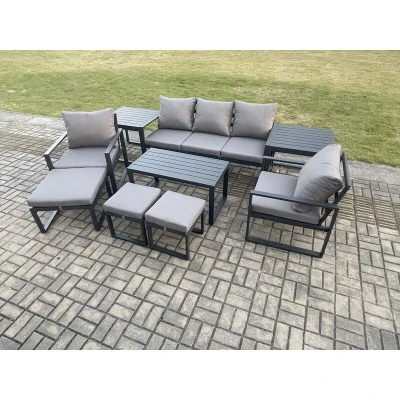 Fimous Aluminium 9 Pieces Garden Furniture Sofa Set with Cushions 8 Seater Outdoor Patio 2 Armchair 3 Footstools Side Table Dark Grey