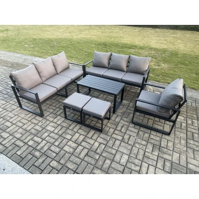 Fimous Aluminium 9 Seater Garden Furniture Outdoor Patio Sofa Set with Rectangular Coffee Table Armchair 2 Small Footstool Dark Grey
