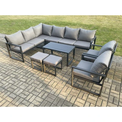 Fimous Aluminium Garden Furniture Set Outdoor Indoor Lounge Corner Sofa 2 Pcs Chair Oblong Coffee Table Sets with Small Footstools Dark Grey