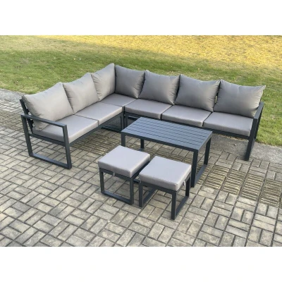 Fimous Aluminium Garden Furniture Set Outdoor Indoor Lounge Corner Sofa Oblong Coffee Table Sets with 2 Small Footstools Dark Grey