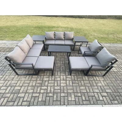 General description This 10-seater deluxe aluminium outdoor sofa set is a perfect addition to your patio or garden. It is constructed from high-quality alloy aluminium with a powder coating that ensures sturdiness and structural durability. The set includes two 3-seater sofas, two chairs, two side coffee tables, two big footstools, and one oblong coffee table, all designed for comfort and style. Technical specifications 2 x 3 Seater Sofa: 166W x 73D x 78H cm 2 x Chair Size: 74L x 70W x 78H cm 2 x Side Coffee Table: 68L x 68W x 59H cm 2 x Big Footstool: 60L x 60W x 35H cm 1 x Oblong Coffee Table: 97L x 52W x 51H cm Color: Dark grey powder coated with dark grey fabric Installation The items come flat-packed and are easy to assemble. Please ensure to check the product carefully upon delivery for any damages. Usage For optimal maintenance, keep the cushions indoors or use a rain cover when not in use. It is recommended to cover the furniture with a rain cover if not used for an extended