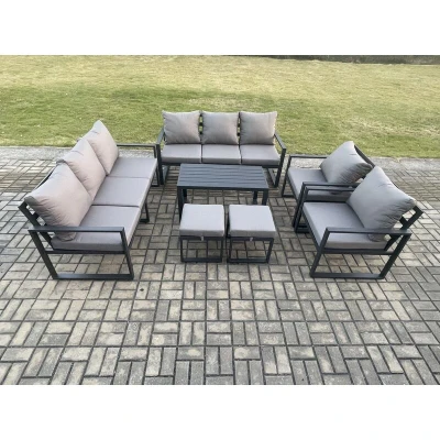 General description This 10-seater deluxe aluminium outdoor sofa set is a perfect addition to your patio or garden. It is constructed from high-quality alloy aluminium with a powder coating for enhanced sturdiness and structural durability. Technical specifications 2 x 3 Seater Sofa: 166W x 73D x 78H cm 2 x Chair Size: 74L x 70W x 78H cm 2 x Fully Assembled Stool Size: 40L x 40W x 36H cm 1 x Oblong Coffee Table: 97L x 52W x 51H cm Color: Dark grey powder-coated with dark grey fabric Installation Items come flat-packed and are easy to assemble. Usage Keep the furniture covered with a rain cover when not in use for an extended period. Store cushions indoors or with a rain cover when not in use. Other information This item is for kerbside delivery only; it cannot be delivered to your room. Warranty and support are available; contact the after-sales team for any issues regarding assembly, missing parts, or product quality.