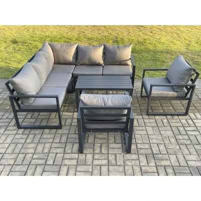 General description This 7-seater deluxe garden furniture set is constructed from sturdy alloy aluminum, ensuring durability and longevity for outdoor use all year round. It adds a stylish touch to your patio, deck, backyard, porch, or pool area. Technical specifications Left Sofa with single armrest: 125W x 70D x 78H cm Right Sofa with single armrest: 125W x 70D x 78H cm Corner Sofa: 70L x 70W x 78H cm Chair Size: 74L x 70W x 78H cm (2 pieces) Oblong Coffee Table: 97L x 52W x 51H cm Color: Dark grey powder-coated aluminum with dark grey fabric Cushion Thickness: 9 cm Installation The furniture set comes flat-packed and is easy to assemble. Please ensure to check the product carefully upon delivery for any damages. Usage For optimal maintenance, keep the cushions indoors or use a rain cover when not in use. It is recommended to cover the furniture with a rain cover if it will not be used for an extended period. Other information This item is delivered kerbside only and cannot be