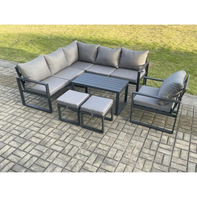Fimous Aluminium Outdoor Garden Furniture Set Lounge Sofa Oblong Coffee Table Sets with Chair 2 Small Footstools Indoor Conservatory Dark Grey