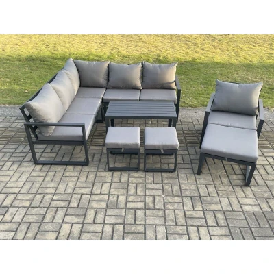 Fimous Aluminium Outdoor Garden Furniture Set Lounge Sofa Oblong Coffee Table Sets with Chair 3 Footstools Indoor Conservatory Dark Grey