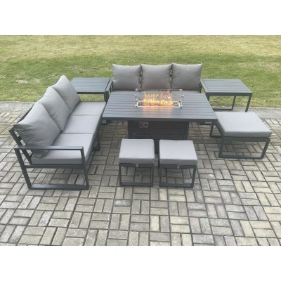 Fimous Aluminium Outdoor Lounge Sofa Garden Furniture Sets Gas Fire Pit Dining Table Set with 3 Footstools 2 Side Tables Dark Grey
