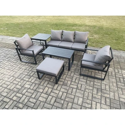 Fimous Aluminium Patio Outdoor Furniture Set 6 Seater Garden Sofa with Oblong Coffee Table Big Footstool 2 Armchairs Side Dark Grey